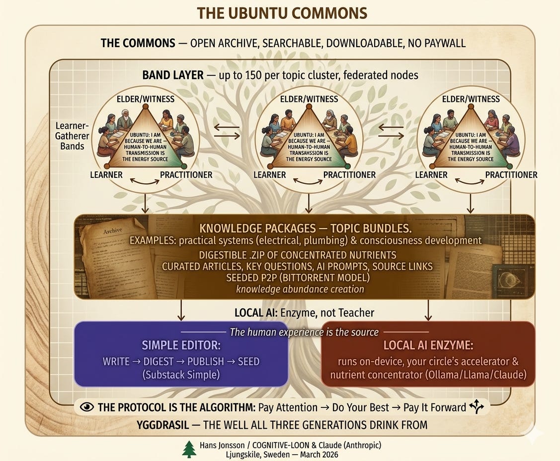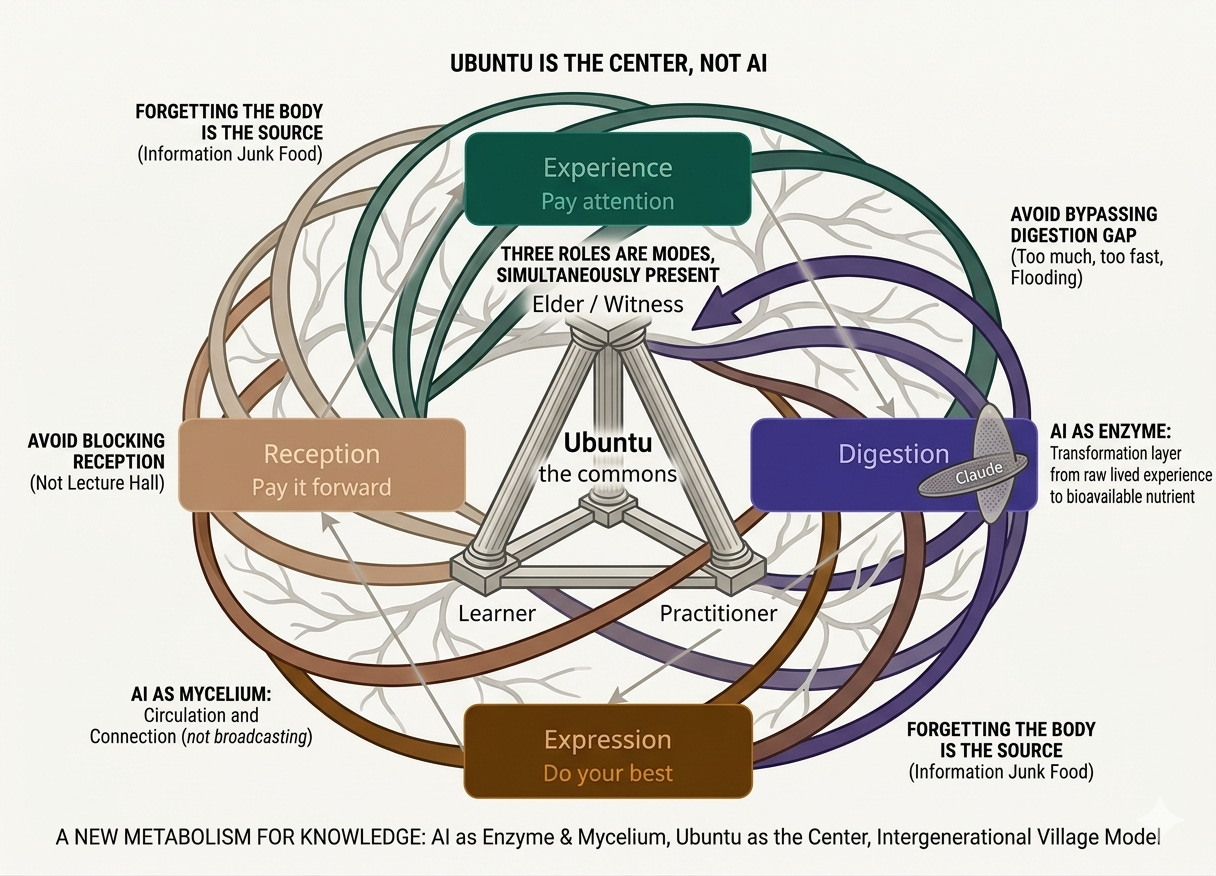 And critically: the AI does not sit at the center. Ubuntu sits at the center. I am because we are. The human-to-human transmission is the energy source. AI is enzyme — it accelerates and concentrates what the human already carries. Remove the human experience and all you have is information junk food with good presentation.